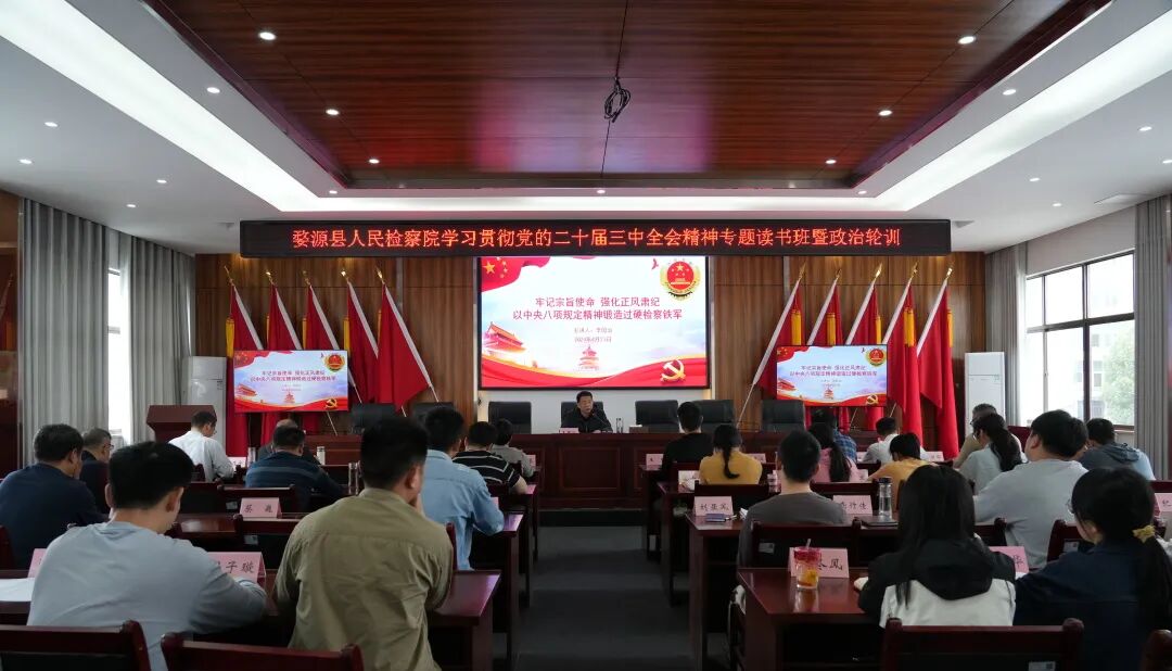 为教育引导全体干警充分认识党的二十届三中全会重大意义、准确把握党的二十届三中全会精神核心要义,4月23日至4月25日,婺源县人民检察院举办了为期三天的学习宣传贯彻党的二十届三中全会精神专题读书班暨政治轮训,党组书记、检察长李国治出席开班式并作动员讲话,全体检察干警参加。