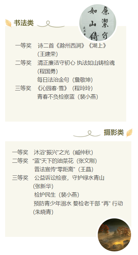为深入学习贯彻习近平法治思想、习近平文化思想,认真落实最高检关于加强新时代检察文化建设的意见,进一步丰富干警精神文化生活,营造浓厚的检察文化氛围,我院近期组织开展了“诗意绘山河 检魂展担当”书法摄影比赛,共收到干警参赛作品20多件,其中摄影作品10余件,书法作品10余件。经相关专家老师评选,评出各类别一、二、三等奖,下面让我们一起来欣赏一下干警们的优秀作品: