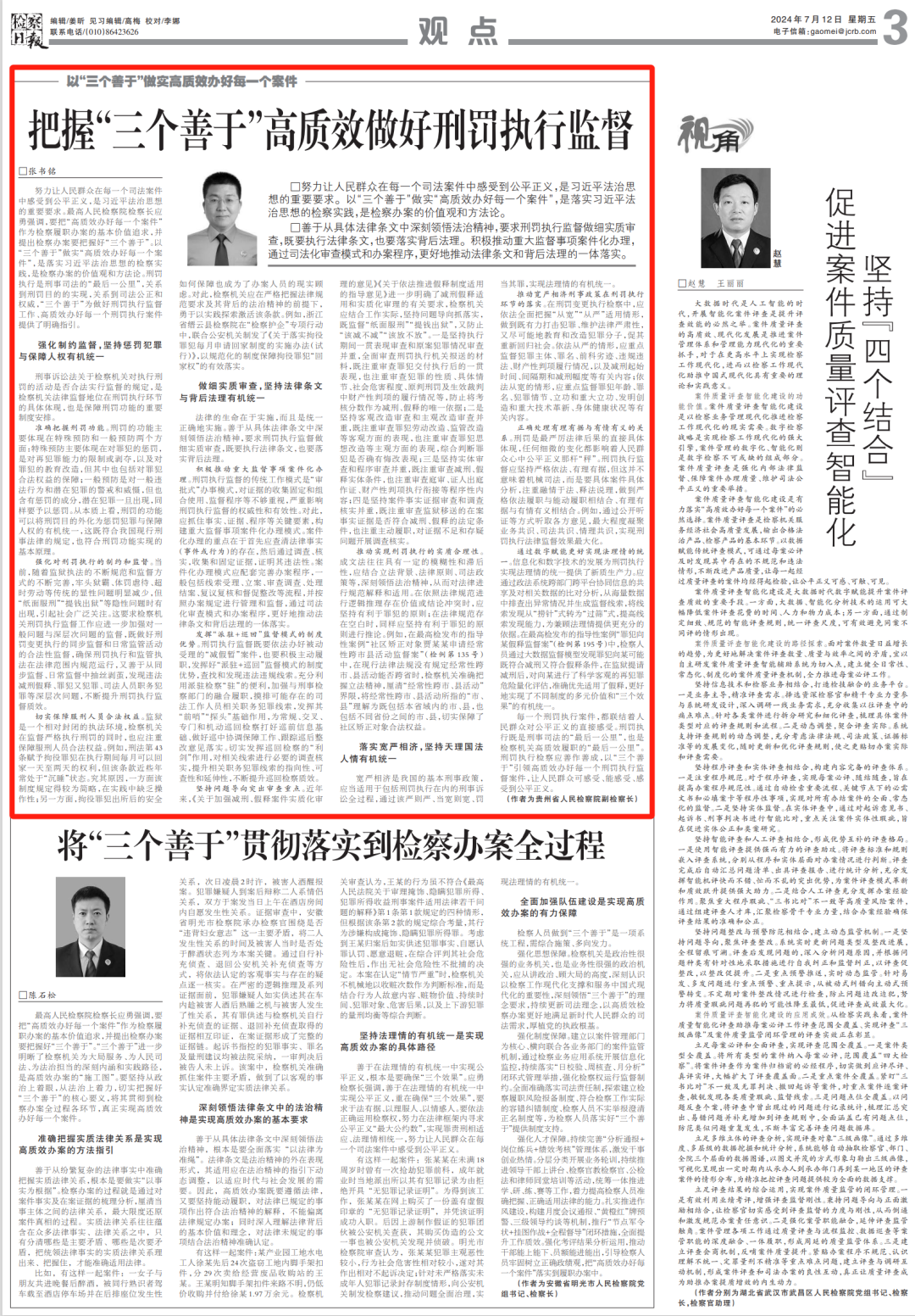 努力让人民群众在每一个司法案件中感受到公平正义,是习近平法治思想的重要要求。以“三个善于”做实“高质效办好每一个案件”,是落实习近平法治思想的检察实践,是检察办案的价值观和方法论。