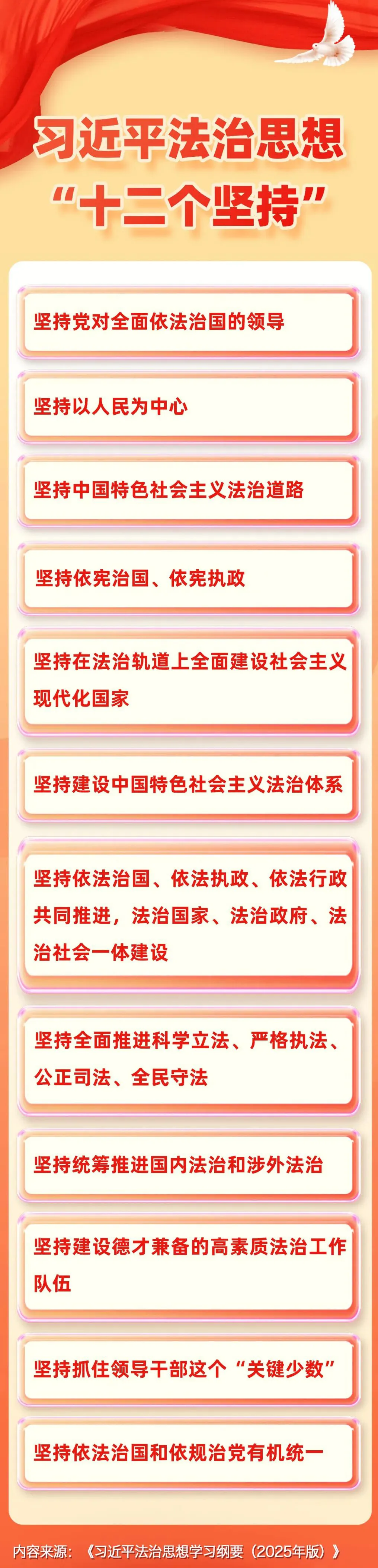 为把学习贯彻习近平新时代中国特色社会主义思想特别是习近平法治思想不断引向深入,中央宣传部、中央依法治国办对2021年出版的《习近平法治思想学习纲要》进行修订,组织编写《习近平法治思想学习纲要(2025年版)》(以下简称《纲要(2025年版)》)一书。《纲要(2025年版)》指出,习近平法治思想内涵丰富、论述深刻、逻辑严密、系统完备,就其主要方面来讲,集中体现为“十二个坚持”: