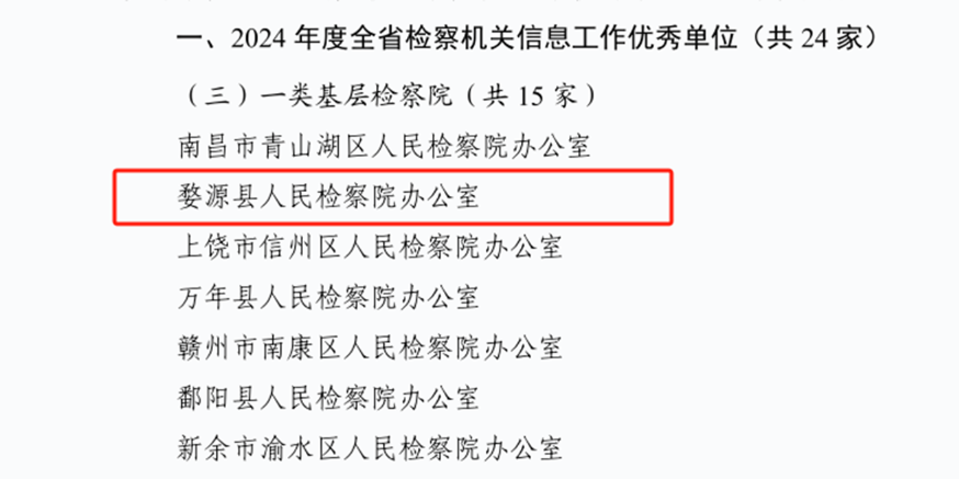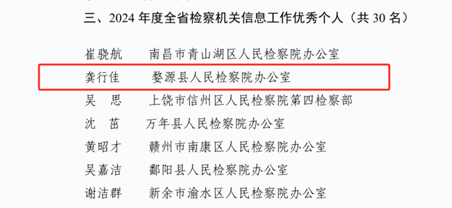 近日,江西省人民检察院下发《关于表扬2024年度全省检察机关信息工作优秀单位、进步较大单位和优秀个人的通报》,婺源县人民检察院办公室获评“2024年度全省检察机关信息工作优秀单位”,我院检察干警龚行佳获评“2024年度全省检察机关信息工作优秀个人”。