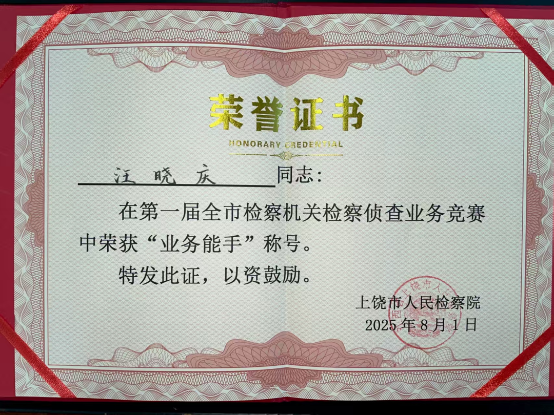 2025年7月31日至8月1日,上饶市人民检察院组织的第一届全市检察机关侦查业务竞赛在广信区检察院进行,我院参赛干警经过激烈角逐获得佳绩,检察干警汪晓庆获“业务能手”称号!