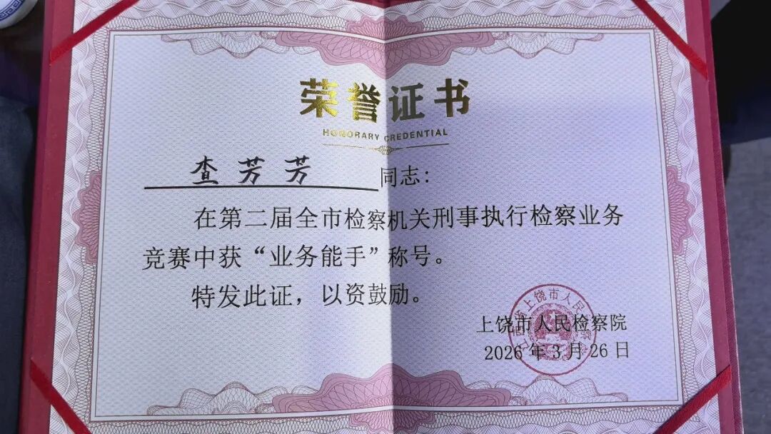 2026年3月26日,第二届上饶市检察机关刑事执行检察业务竞赛圆满落幕。婺源县人民检察院干警查芳芳荣获“业务能手”称号。