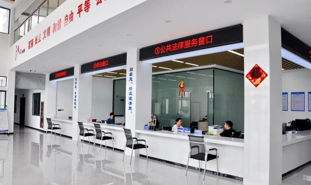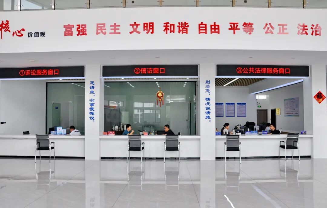 群众接待大厅设置综合受理、诉讼服务、公共法律服务、信访接待,以及公安、人社、住建、自然资源、城管、教体、卫健、总工会、妇联等进驻单位10个服务窗口。
